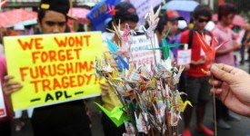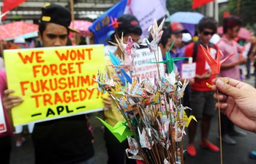 Filipino environmental activists against nuclear powered plants light candles and offer flowers as they hold placards and paper cranes during a commemoration for Japan’s 2011 earthquake and tsunami in front of the Japanese embassy in Manila on March 12, 2012. The activists said the disaster in Fukushima nuclear meltdown destroyed all illusion of how safe nuclear energy is around the world. AFP PHOTO / JAY DIRECTO (Photo credit should read JAY DIRECTO/AFP/Getty Images)