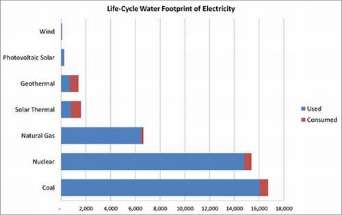 Molta dell’acqua infatti viene sprecata per far funzionare questi enormi colossi, e come dimostra il grafico qui sopra, l’impatto di una centrale è quasi uguale a quello di una a carbone. Sull’asse orizzontale c’è l’acqua consumata, basata sul ciclo di vita della produzione di un megawattora di energia elettrica da ciascuna sorgente. Quindi, non è solo quanto viene consumato per produrre l’elettricità, ma nel caso dell’energia eolica o solare anche per realizzare la tecnologia, o nel caso del carbone la fase di estrazione.