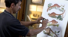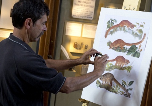 A man photographs illustrations of an olinguito, the first carnivore animal species to be discovered in the American continents in 35 years, during a press conference announcing the discovery at the Smithsonian Institution in Washington, DC, August 15, 2013. The 2-pound (900 grams) mammal, the smallest member of the raccoon family, mainly eats fruit, insects and nectar, and can be found only in the cloud forests of the northern Andes Mountains in Ecuador and Columbia. AFP PHOTO / Saul LOEB (Photo credit should read SAUL LOEB/AFP/Getty Images)