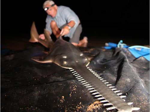 Jeremy Wade, pescatore estremo, biologo e conduttore del programma televisivo Monsters Animal Planet’s River, si è recato in Australia, uno dei pochi luoghi al mondo che ha ancora un notevole popolazione di pesci sega, per saperne di più. La loro caratteristica potrebbe essere la loro condanna a morte, dato che il naso che dà al pesce sega il suo nome è soggetto ad aggrovigliamenti nelle reti dei pescatori.