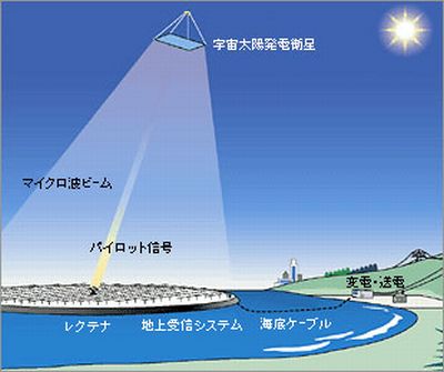 Per questo il termine “flusso di energia solare” sarà usato come alternativa al raggio laser. Il funzionamento sarà simile a quello dell’mmagine sopra, con un flusso solare che parte dal dispositivo nello spazio e lancerà il segnale direttamente a terra, dove ci sarà una centrale a forma di zattera che lo capta, lo trasforma in energia, e lo invia nelle case dei giapponesi.