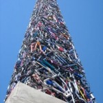 L’obelisco qui sopra è stato battezzato Cyclisk, si trova su una strada piena di concessionarie d’auto anche se non è molto comodo come mezzo di trasporto. E’ composto da 340 biciclette e un triciclo e raggiunge i 65 piedi (quasi 20 metri) di altezza. La scultura è costata 37.000 dollari (circa 28 mila euro) finanziata con i fondi di Nissan che sta costruendo un concessionario di automobili nella città di Santa Rosa. Le leggi municipali impongono che l’1% del costo dei grandi progetti di costruzione sia da destinare all’arte pubblica, e così la Nissan ha pensato a quest’opera.