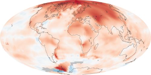 L’obiettivo, secondo gli scienziati GISS, è quello di fornire una stima della variazione di temperatura che può essere confrontata con le previsioni del cambiamento climatico globale, in risposta all’aumento della CO2 atmosferica, aerosol, e cambiamenti dell’attività solare. Le temperature che sperimentiamo a livello locale in un breve periodo possono variare notevolmente a causa di prevedibili eventi ciclici (giorno e notte, estate e inverno) e difficili da prevedere come i venti e le precipitazioni. Ma la temperatura globale dipende principalmente dalla quantità di energia che il pianeta riceve dal Sole e quanta si irradia nello spazio. La quantità di energia emessa dalla Terra dipende in maniera significativa dalla composizione chimica dell’atmosfera, in particolare la quantità di calore che intrappola i gas serra e, come queste immagini dimostrano chiaramente, l’anomalia dal 1979 (seconda immagine) al 2009 (prima immagine) è troppo evidente per poter essere negata.