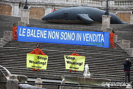 Singolare protesta di Greenpeace questa mattina a Piazza di Spagna, Roma. Gli attivisti hanno arenato una balena gigante sulla scalinata di Trinità dei Monti. Il cetaceo, lungo 15 metri, fa da sfondo allo striscione: Le balene non sono in vendita.
