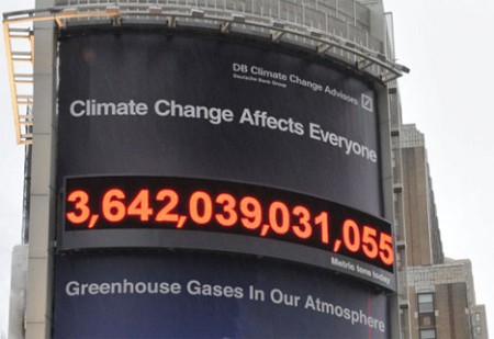 Il cartellone, primo al mondo scientificamente valido, aggiorna in tempo reale l’indicatore delle emissioni di carbonio, è stato inaugurato ufficialmente ieri dalla Deutsche Bank e dalla divisione Asset Management di un team di ricercatori del Massachusetts Institute of Technology (MIT). All’inaugurazione, il cartellone ha dimostrato che esistono attualmente 3,64 miliardi di tonnellate di gas a effetto serra nell’atmosfera e che la cifra è in aumento di 800 tonnellate al secondo.