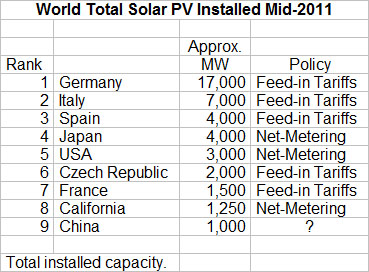 Le nuove statistiche provenienti dal GSE parlano di un incremento eccezionale del fotovoltaico in Italia nel 2010, addirittura superiore (e di molto) a quello dei colossi come Stati Uniti e Cina. Se infatti la Germania è inarrivabile con i suoi 17 GW installati, l’Italia nella classifica di energia fotovoltaica complessiva supera tutte le altre nazioni, arrivando a 7 GW.