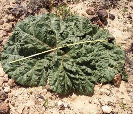 Questo è il primo esempio di un auto-irrigazione delle piante in tutto il mondo. Il rabarbaro cresce tra le montagne del deserto del Negev, Israele, dove la precipitazione media è particolarmente bassa (75 mm all’anno). A differenza della maggior parte delle altre specie di piante del deserto, che hanno foglie piccole in modo da ridurre al minimo la perdita di umidità, questa pianta ha foglie particolarmente grandi, con un diametro massimo di un metro. I professori Simcha Lev-Yadun, Gidi Ne’eman e Gadi Katzir si sono imbattuti in questa singolare pianta mentre studiavano la zona con i loro studenti.