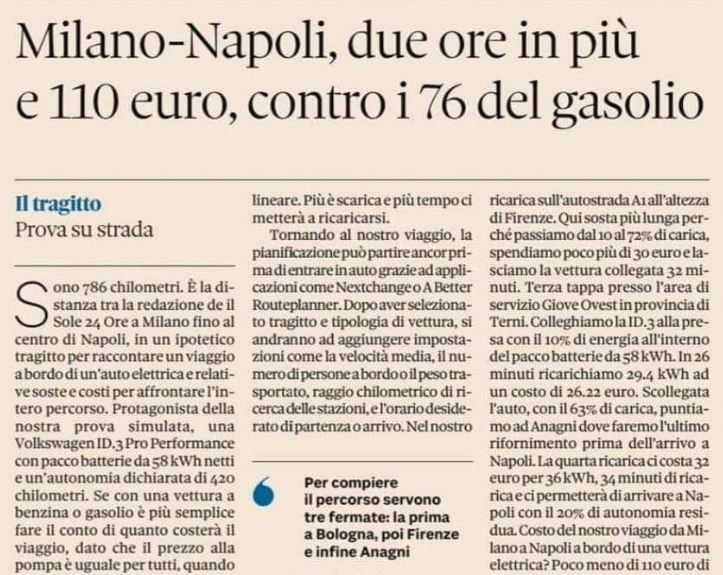 Argomento: auto elettriche. Fatto: un giornalista decide di simulare un calcolo per determinare quanto si spenderebbe per un viaggio utilizzando app come Nextcharge o ABRP. Titolo dell’articolo: “Milano-Napoli, due ore in più e 110 euro contro i 76 del gasolio”. Contenuto: contraddittorio – ma in quanti si fermano al titolo? Effetto: allarme e indignazione.