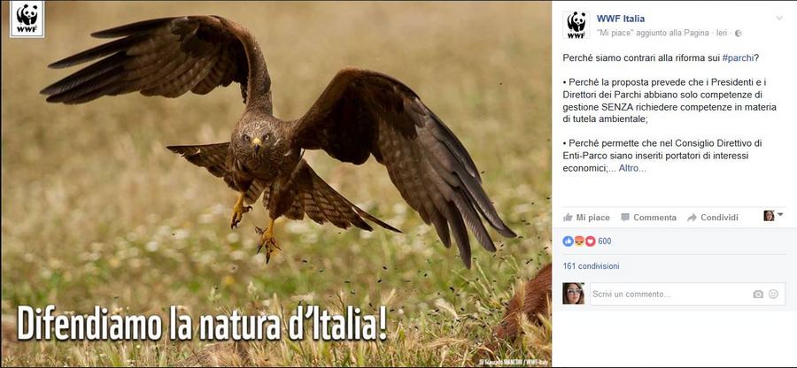 Oppure chiede di inviare un twitt con hashtag #sosnaturaditalia con il testo: «@lauraboldrini @PietroGrasso perché stravolgere la più importante legge italiana per la tutela della natura? #sosparchi con @WWFitalia».